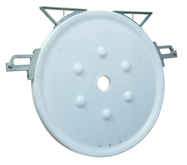 2、濾腔進(jìn)料孔附近均勻設(shè)有4只支撐柱,濾板成型后,整體強(qiáng)度加大,延長使用壽命,濾餅直徑放大10mm, 確保產(chǎn)量不變;
