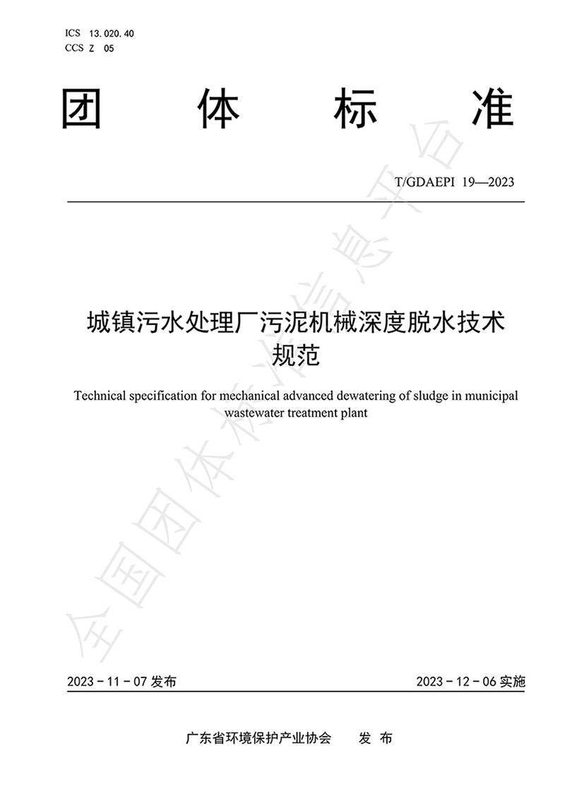 2023年11月7日,我司參與起草制定的《城鎮(zhèn)污水處理廠污泥機械深度脫水技術規(guī)范》(T/GDAEPI19-2023)經(jīng)廣東省環(huán)境保護產業(yè)協(xié)會正式發(fā)布。
