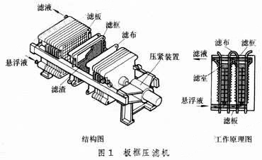 板框壓濾機由交替排列的濾板和濾框構成一組濾室。濾板的表面有溝槽,其凸出部位用以支撐濾布。濾框和濾板的邊角上有通孔,組裝后構成完整的通道,能通入懸浮液、洗滌水和引出濾液。板、框兩側各有把手支托在橫梁上,由壓緊裝置壓緊板、框。板、框之間的濾布起密封墊片的作用。由供料泵將懸浮液壓入濾室,在濾布上形成濾渣,直至充滿濾室。濾液穿過濾布并沿濾板溝槽流至板框邊角通道,集中排出。過濾完畢,可通入清洗滌水洗滌濾渣。洗滌后,有時還通入壓縮空氣,除去剩余的洗滌液。隨后可自動打開濾室卸料..然后重新壓緊進行下一班過濾。