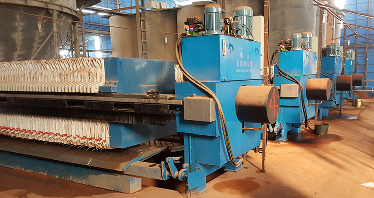 壓濾機主體是由機架、大梁、液壓缸和一組濾板(被濾布包覆)組成的。
